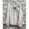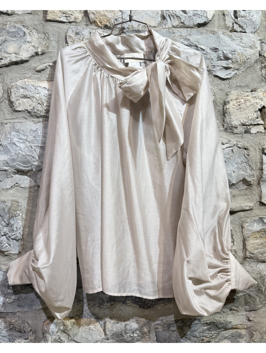 Camicia over con colletto con laccio e maniche lunghe. Dettaglio maniche ampie a sbuffo con bottoncini ricoperti.