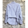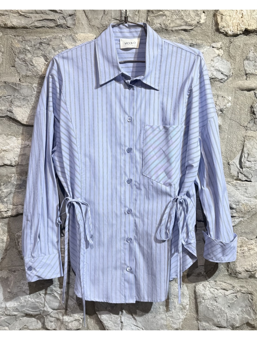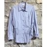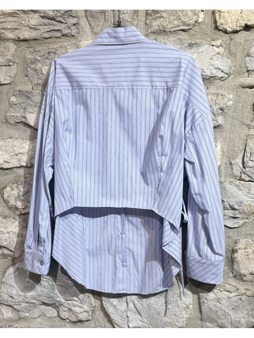 Camicia a righe bianca e azzurra, più lunga davanti e più corta dietro con laccini sul punto vita.